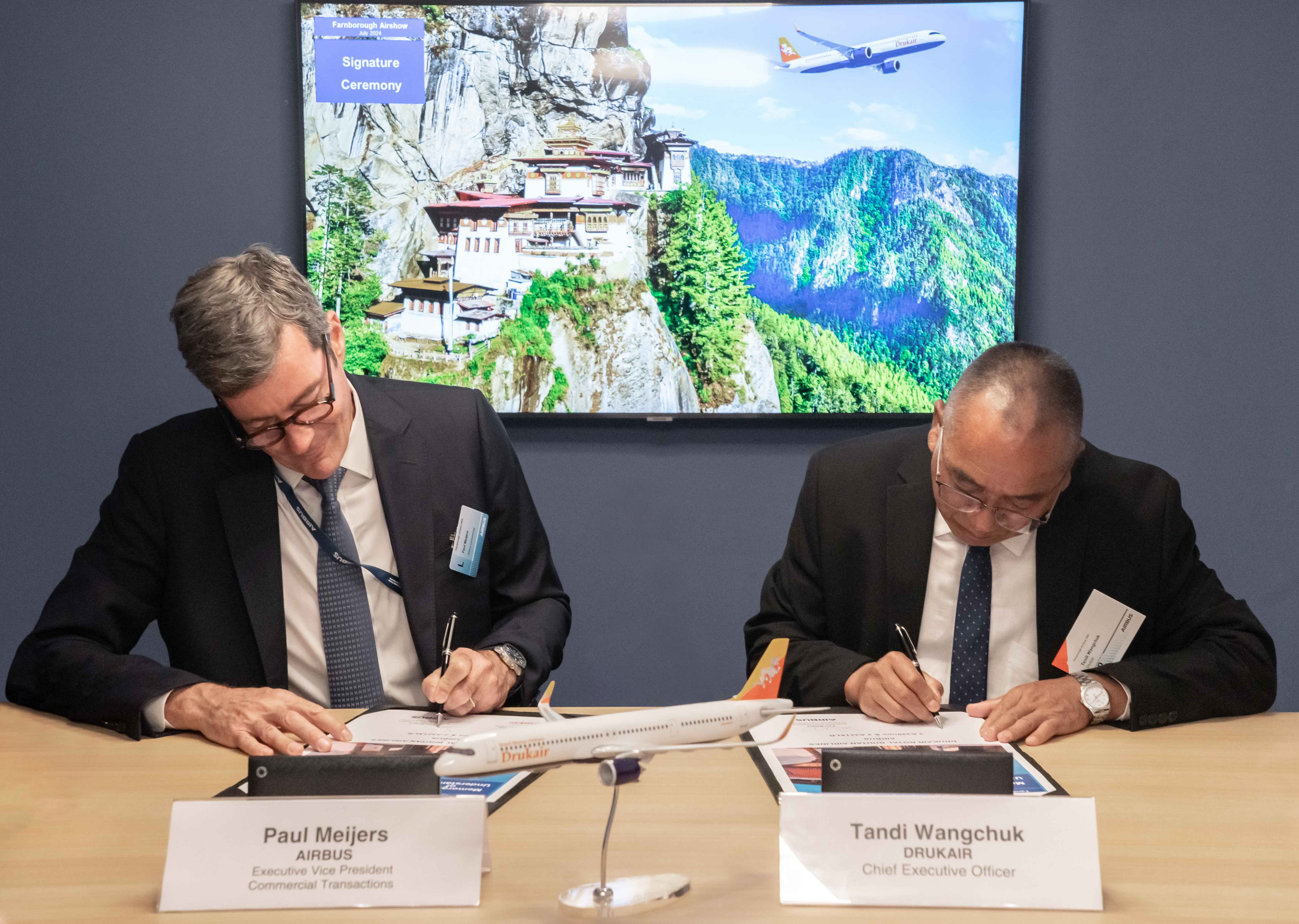 The signing ceremony took place at the Farnborough Air Show and was led by CEO Mr. Tandi Wangchuk, Chief Pilot Yab Dasho Dhondup Gyaltshen and the members of Drukair board. This move is inspired by His Majesty’s noble vision for a mindfulness city.