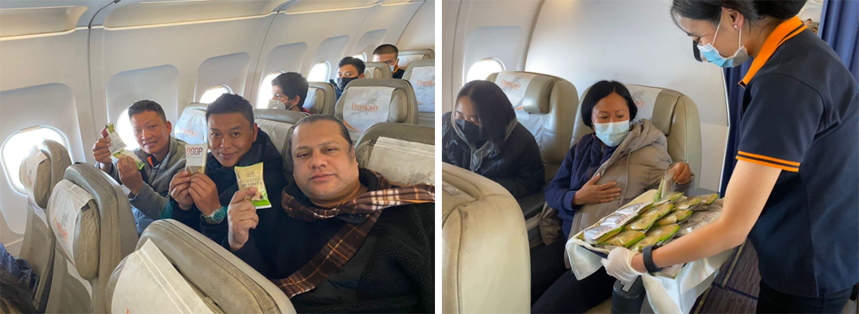 21 February 2022: To mark the most joyous occasion of the 42nd Birth Anniversary of His Majesty The King, Drukair, Royal Bhutan Airlines is pleased to announce the launch of new varieties of organic fresh snacks, Roasted Peanuts & Mix Fruit Candy on board in partnership with the OGOP, One Gewog, One Product programme.